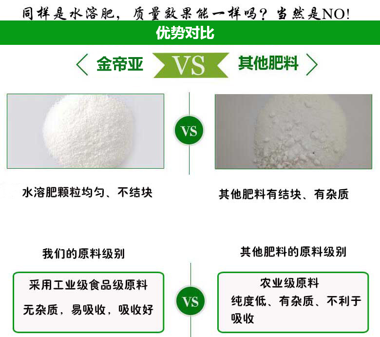 我們是平衡全營養型水溶肥,采用進口優質原料,并特別添加聚谷氨酸,既含有作物生長所需要的大量元素,還添加有多種螯合態微量元素,給作物生長提供全面的養分,高吸收、高效果,能有效預防作物的多種缺素癥狀,適合作物萌芽、展葉、促梢時使用,也可恢復樹勢,解決植株生長的不良性狀。